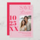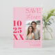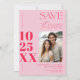 This modern save the date card features a sleek and minimalist design, perfect for couples who love a clean and sophisticated aesthetic. The card prominently displays the wedding date in bold, large typography on the left side, ensuring that the date stands out and is easily noticed. On the right side, there’s a dedicated space for a photo of the couple, adding a personal touch to the announcement. The text is elegantly arranged in a contemporary font, keeping the focus on the essential details like the couple's names, wedding date, and location. The use of hot neon pink and retro pastel pink creates a timeless look, making this card a stylish choice for any modern wedding.