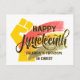 Stylish modern Christian JUNETEENTH Postcard with CUSTOMIZABLE TEXT on the reverse. The design shows paint strokes in red, orange and green, with a background of red, yellow and green grunge-effect brush strokes and yellow power fist. The wording reads HAPPY JUNETEENTH - CELEBRATE FREEDOM IN CHRIST. You can personalise your message on the reverse. This Juneteenth postcard would be great to send to anyone who wants to celebrate this African American Black independence day holiday and also share the Christian message of freedom in Christ Jesus.