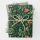 Modern coordinated gift wrap of 3 wrapping sheets featuring Christmas Foliage Forest and Rustic Stripes in forest and sage green. The first design features mistletoe, holly, spruce and Christmas berries in green and red. The second designs features a rustic forest of Christmas trees in sage greens. The third design features rustic stripes in cream in sage green. Perfect for a modern, yet traditional Christmas.