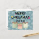 A pretty Christmas card with a modern style Typography design and gift box graphics with snowflakes background. The outside reads "Merry Christmas 20XX" for you to change your preferred year and the back side displays a Christmas wreath and family greetings to be personalised by you.