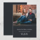 Stylish modern holiday photo flat photo card with a classic typography quote "warm holiday wishes - from our family to yours" paired with a handwritten script font for your family name in white on a bluish off black background. The greeting and name can be easily customized for a your own unique design. A minimalist and contemporary design to stand out this holiday season! The image shown is for illustration purposes only to be replaced with your own photo. The placeholder image is of couple sitting together in thier stylish home.