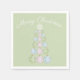 This paper napkin design features three non-traditional colour Christmas ornaments in pastel green, pink, and blue with white stars. The ornaments are stacked and staggered in size to form a Christmas tree shape over a green background. Leave the "Merry Christmas" template text as it is, personalise it or remove it completely.