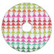 This cute holiday Christmas tree skirt features a festive modern pattern of triangle trees in red, green, pink, and orange.