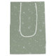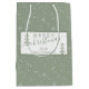 Modern, personalised Christmas holiday gift bag with cute abstract Christmas trees and forest trees and winter snow patterns in shades of sage, green and white with the greeting MERRY CHRISTMAS in handwritten script with your name or custom text. The sample is shown in the MEDIUM size--other sizes are available on the ordering page. ASSISTANCE: For help with design modification or personalisation, colour change, resizing or transferring the design to another product, contact the designer BEFORE ORDERING via the Zazzle Chat MESSAGE tab below or email makeitaboutyoustore@gmail.com.