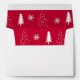 Design features white Christmas trees and snowflakes against red background.  Happy Holidays!