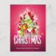 Holiday postcard with a cool Christmas illustration. The text says Merry Christmas & Happy New Year. Designed with a tree shaped mound of presents with festive snowflakes, stars, christmas baubles and glowy looking sparkles. The background is a vibrant reddish pink colour.