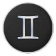 A silver chrome like Gemini zodiac symbol applique on a black snake skin design texture print background. A modern racy design for a great custom birthday gift idea.