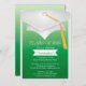 Modern class of 2014 graduation party invitation featuring a white grad cap and white banner set on a ombre watercolor green background for a high school or college graduation for a boy or girl. Visit our shop for a variety of trendy popular school colour themes.