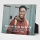 Celebrate your graduate with this modern graduation plaque with easel sign. Simple design features a senior portrait of your grad with white striped overlay wording in varsity sports style lettering that can be personalised with the graduates name, school, and class year. Makes a beautiful keepsake to display in your home.