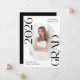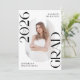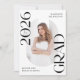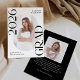Announce the graduate's big achievement in style with this modern photo graduation announcement. The trendy design features "Class of 2025 Grad" in bold black lettering with subtle script accents with a solid white background. The graduate's vertical photo is displayed inside an oblong frame at the centre of the announcement. Personalise the front of the black and white graduation announcement with the graduate's name and school. The announcement reverses to display an additional photo displayed inside of a white square frame with your custom text shown below. The stylish graduation announcement is perfect for high school and college graduates.