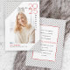 Modern lines class of 2025 graduate black and red graduation photo announcement. An elegant design that showcases your photo, black stripes on the top left anf bottom right corners, the year 2025 in red and the word "Graduate". The back includes a frame with your wording and a black and white striped border.