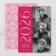 Stylish graduation announcement featuring the graduate's three photos located to the right of the design in a vertical layout. "2026" is displayed in white, modern art deco lettering with a magenta background. Personalize the modern photo graduation announcement by adding the graduate's name and school name. The design reverses to display a magenta and white geometric swirl background. Perfect for both high school and college graduations!