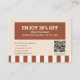 Treat your customers to sweet savings with this beautifully designed Modern Classic Brown Beige Bakery discount card! Featuring a rich brown background accented with delightful beige doodle illustrations of baked goods—like bread, cupcakes, and pastries—this card exudes warmth and creativity, perfectly reflecting your bakery’s charm. Ideal for special promotions, seasonal offers, or customer appreciation events, the discount card is fully customisable with your bakery’s name, contact information, and discount details. Its rustic yet playful design makes it an irresistible keepsake for customers, encouraging repeat visits and boosting loyalty. Delight your customers and make every purchase sweeter with this thoughtfully designed discount card!