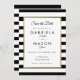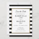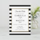 Featuring a classic black and white stripe background, this elegant save the date card features an elegant faux gold foil border framing your save the date details set in chic typography. Designed by Thisisnotme©