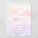 An elegant, whimsical and dreamy bridal shower invitation featuring watercolor clouds in pastel colours of purple and pinkish yellow featuring a calligraphy script saying "she's on cloud nine".