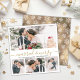 Elegant Modern Calligraphy White and Gold 4 Photo Collage Married and Merry Christmas Card. This mimimalist festive newlywed christmas card features four (4) grid photo collage and „Married and Merry” greeting text which is written in a beautiful hand lettered swirly swash-tail font type in gold and white. On the reverse side pretty snowy snowflakes on faux gold foil background. Pretty greeting cards easy way to send greetings to family and friends for your first Christmas as husband and wife in Christmas Holiday season.
