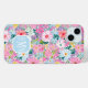 Customize this gorgeous modern colorful flower garden of flowers in pink, blue, purple and yellow iPhone 15 plus case with your your initials in a modern CAP font in white on blue. It's so vibrant and happy!