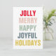 Vibrant colored letters, trees, holly and cancy canes in a cheerful message suitable for a non-religious holiday greeting. I especially liked it on the black background which made the design pop.