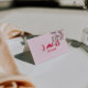 Modern minimalist wedding place card designed for a clean and elegant reception table setting. This folded escort card features a handwritten script wedding name paired with contemporary typography. The magenta red and pink wedding decor adds a fresh, stylish touch to your wedding. Perfect as a custom guest name card for a chic and simple wedding celebration. Use this elegant folded place card to elevate your modern reception table decor. A sophisticated contemporary wedding table card that complements any minimalist wedding theme.