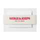 A very elegant and unique hand written whimsical wedding belly band. That matches the whole wedding bold red suite theme vibe. It has bright red script with colourful cream milky background. With bold bright names and date under it.