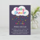Colourful fun baby shower invitation. Design features cloud and rain drops in colours of the rainbow on navy blue background. Add event details in white trendy fonts.