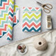 Modern colourful chevron geometric zigzag patter. Mix of bold blue and orange with pastel yellow-green and blue-green. White accents