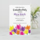 This is a girly, colourful, bright and modern graduation party invitation. Hot pink, purple yellow and orange flowers. The back of the invitation is green. Customisable text allows you to add your information. This invitation can be used for a graduation, birthday or any surprise party.