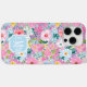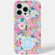 Customise this gorgeous modern colourful flower garden of flowers in pink, blue, purple, and yellow iPhone 15 pro max case with your your initials in a modern CAP font in white on blue. It's so vibrant and happy!