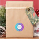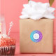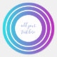 This cute round sticker features a white geometric design on a multicolor gradient in turquoise, blue, and purple with a customisable text in the matching blue calligraphy.