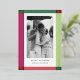 A brightly coloured, vertical, one-photo, nontraditional Christmas card featuring the a modern design of plaid frame with gold foil lines on top. On the back is room to enter your own message. You can also change the colours of the background or add another photo.
