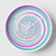This round clock without numbers features an abstract spiral design in 3 colours: white, purple, and teal.