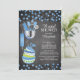 Modern stock the kitchen bridal shower invitation featuring a rolling pin, mixing bowl, spatula, pizza cutter, whisk, vegetable peeler and measuring spoons set on a contemporary chalkboard background with periwinkle blue & black polka dot confetti. Visit our shop to view this invitation in a variety of popular wedding shower invitations.