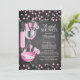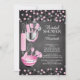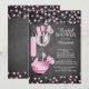 Modern stock the kitchen bridal shower invitation featuring a rolling pin, mixing bowl, spatula, pizza cutter, whisk, vegetable peeler and measuring spoons set on a contemporary chalkboard background with pink & black polka dot confetti. Visit our shop to view this invitation in a variety of popular wedding shower invitations.