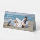 Welcome your guests to their table with a beautiful newlywed photo with simple white script of the number on their full bleed engagement photograph. Customise each table with a different engagement photo table tent sign. Chic and stylish wedding reception decor.