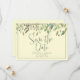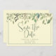 Modern Save the Date announcements feature watercolor watercolor eucalyptus leaves border on cream background with green customisable text blocks in modern fonts