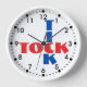 Here's a cool red and blue pattern clock design for any home or office wall. This lightweight acrylic wall clock face has a contemporary designed blue word "Tick" and the red word "Tock" in a crossword puzzle style typography over a white background. The design includes an outer ring of black elements and an inner ring of black numbers.