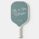 Modern Mint Green Pickleball Paddle with the couple's family name in modern script font for a Pickleball wedding, wedding anniversary or other celebration. Fully customisable colour and text.