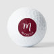 Customise golf balls with your initial monogram and name. Designed with a bold white script font on a deep red background.