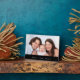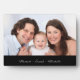 This is a modern custom design that can be personalised with your favourite photo and your names. A popular script font adorns a black border at the bottom.