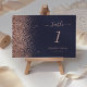 The left-hand edge of this elegant modern wedding table number features a rose gold faux glitter design. The customisable text combines pale rose coloured handwriting, copperplate and italic fonts on a dark blue background.