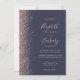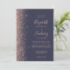 The left-hand edge of this elegant modern wedding invitation features a rose gold faux glitter design. The customisable text combines pale rose-coloured handwriting, copperplate and italic fonts on a dark blue background. The reverse side provides space for wedding details on a solid dark blue background, along with a QR code guests can scan to visit your website and RSVP, which saves the cost of printing and mailing separate RSVP cards.