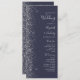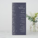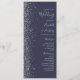 The left-hand edge of this elegant modern wedding program features a silver faux glitter design. The customisable text combines silver grey handwriting, copperplate and italic fonts on a dark navy blue background.