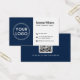 Modern, white and dark blue business cards with custom logo template and QR cude on the back. Modern, minimal design. Fonts, font colours and background colours can be changed with the customisation tool.