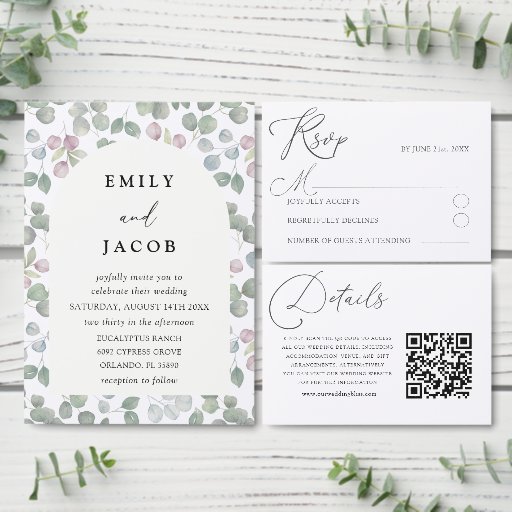 Fall in love with our timeless and elegant real gold calligraphy wedding invitation. The background showcases original watercolor artwork featuring romantic eucalyptus foliage in soft tones of sage green, dusty blue, and deep rose, evoking a lush botanical charm. A luxurious dark green arch elegantly frames your personalised wedding details, creating a modern yet romantic focal point. This invitation blends natural beauty with contemporary design and is fully customisable—perfect for garden weddings, boho celebrations, or elegant rustic themes. Personalise with ease to create a heartfelt keepsake that reflects the beauty and significance of your special day.