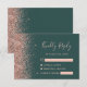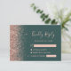 The left-hand edge of this elegant modern wedding RSVP enclosure card features a rose gold faux glitter border. The customisable text combines pale rose coloured handwriting, copperplate and italic fonts on a dark green background. The reverse side features a matching dark green and rose gold design.