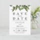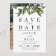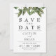 Bold dark greenery or foliage wedding save the date card featuring a bold greenery arrangement at the top of the card. Ideal for a couple having an country, rural farm or outdoor bohemian style wedding.