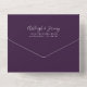 The left-hand edge of this elegant modern all-in-one wedding invitation and RSVP features a silver faux glitter border. The customisable text combines silver grey whimsical handwriting, copperplate and italic fonts on a dark purple background. The return address appears on the outside flap and the reverse side of the detachable RSVP card in silver grey text on solid dark purple.