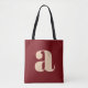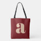 A bold and stylish tote bag featuring a deep cherry red burgundy background with a large beige lowercase letter in modern typography. Perfect for everyday use, shopping, work, or as a statement accessory. This contemporary design blends minimalism with a retro-inspired aesthetic, making it an ideal gift for typography lovers and trendsetters.