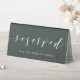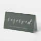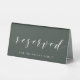 Custom-designed wedding reserved table sign featuring modern hand calligraphy with personalised text on dark sage green colour background.