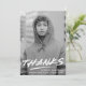 Modern graduation thank you cards featuring the graduate's vertical photo with "Thanks" in white handwritten lettering with a dash below. Personalise the photo graduation thank you card by adding the graduate's name, school name, and graduation year. The back of the card provides space for your typed or handwritten message with a background of black and white dashed brushstrokes.